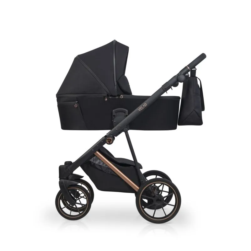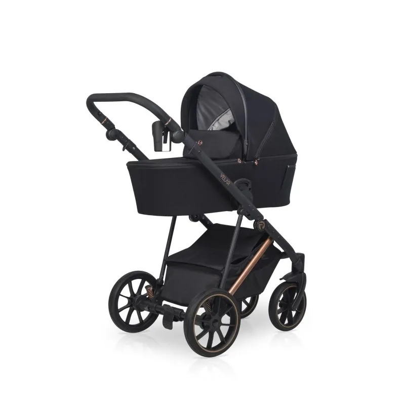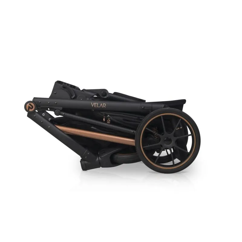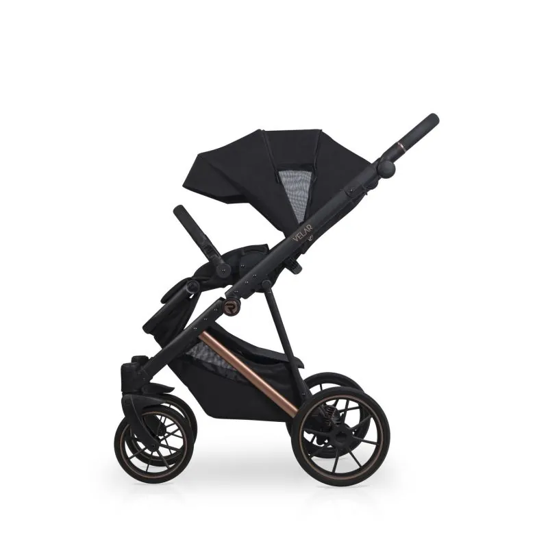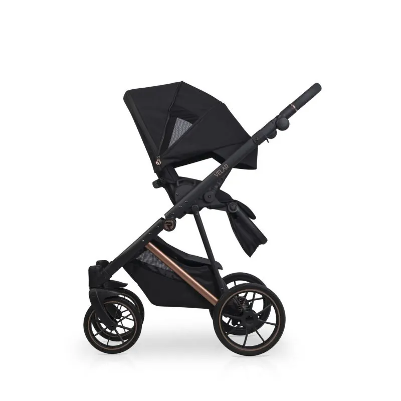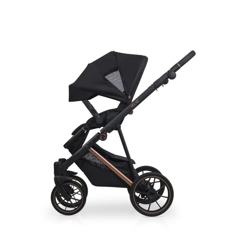 Melns alumīnija rāmis;Četri lieli gēla riteņi nodrošinās lielisku caurgājību;Regulējami mīkstuma amortizatori;Regulējama augstuma stumšanas rokturis: 68 - 103 cm.;Liels, slēgts iepirkumu grozs, kas aizveras ar magnētiem, tāpēc būs ātri pieejams;Uzticama centrālā bremze;Noņemams krūzes vai pudeles turētājs;Viegls un sver tikai 9,2 kg.;Salocīta rāmja izmēri: 59 x 79 x 36 cm.;Aizmugurējie riteņi: 29 cm.;Priekšējie riteņi: 24 cm.;