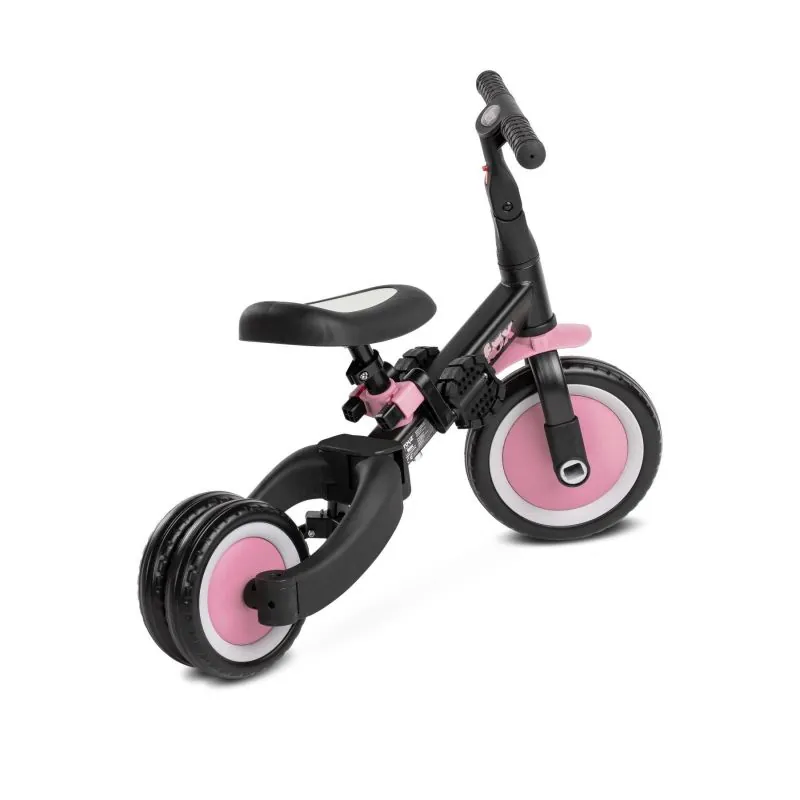 Savienojot vairākus transportlīdzekļus vienā;Maziem bērniem ir grūti saglabāt līdzsvaru, tad var izmantot trīsriteni bez pedāļiem; Jau labi veicas, var mīt trīsriteni ar pedāļiem;Nākamais solis - līdzsvara velosipēds bez pedāļiem;Un pēdējā iespēja - salikt velosipēdu: uz priekšējiem riteņiem uzliekam pedāļus un droši dodamies piedzīvojumos. To visu saliksiet ātri un bez papildu instrumentiem;Vienkārša salikšana un izjaukšana;Rupji, neslīdoši pedāļi;Ērts un neslīdošs stūre;Stūre regulējama divās pozīcijās;Regulējams sēdekļa augstums;Poliuretāna, klusi ripojoši riteņi;Pedāļi noņemami ar vienas pogas nospiešanu;Noņemtie pedāļi piestiprinās zem sēdekļa, uz rāmja;Ērta transportēšana:Eiropas standarts: EN71