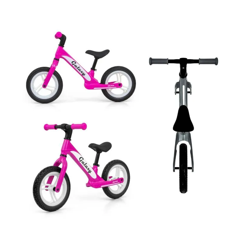 Izgatavoti no izturīga un jaunākās EVA putu tehnoloģijas, 12 collu riteņi, kuriem nav nepieciešama pumpēšana, tāpēc tiem nav nepieciešama apkope. Ergonomisks sēdeklis ar mīkstu pildījumu un augstuma regulēšanas iespēju liek velosipēdam augt kopā ar bērnu. Galaxy ir bumbiņveida torsionu stūre. Neslīdoši, mīksti gumijas rokturi nodrošina uzticamu saķeri un ērtu vadību. Šis līdzsvara velosipēds ir izgatavots, izmantojot bezmetināšanas tehnoloģiju.Īpaši vieglais magnija velosipēda rāmis nodrošina lielāku izturību pret pārslodzēm. Velosipēds ir piemērots ilgstošai lietošanai pašiem mazākajiem un ērti pārnēsājams, pateicoties mazajam svaram.Magnija īpašības ir vieglāk formējamas, salīdzinot ar, piemēram, tēraudu vai alumīniju.