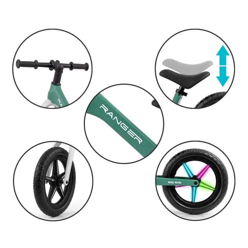 Ergonomiska velosipēda forma – nodrošina nepārspējamu komfortu braucot un pareizu stāju.Rāmis – ļoti viegla konstrukcija.12 collu riteņi, kas izgatavoti pēc jaunākās EVA tehnoloģijas, labi absorbē triecienus, kas palielina braukšanas komfortu.Sēdeklis - ērts mīksts profilēts sēdeklis.Riteņi – unikāls trīs spieķu raksts, kas izceļ velosipēdu.Sēdekļa augstuma regulēšana (35-41 cm)Stūre ar gultņiemViegls rāmisNeslīdoši rokturiĒrts mīksts profilēts sēdeklisRiteņi ar gultņiemVecuma diapazons 2+Atbilst Eiropas drošības standartiem