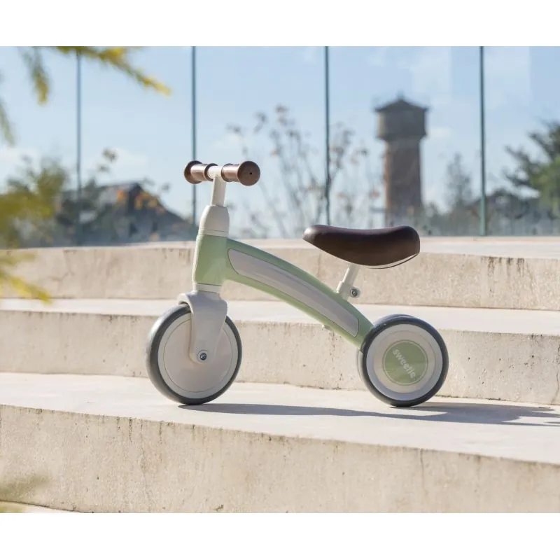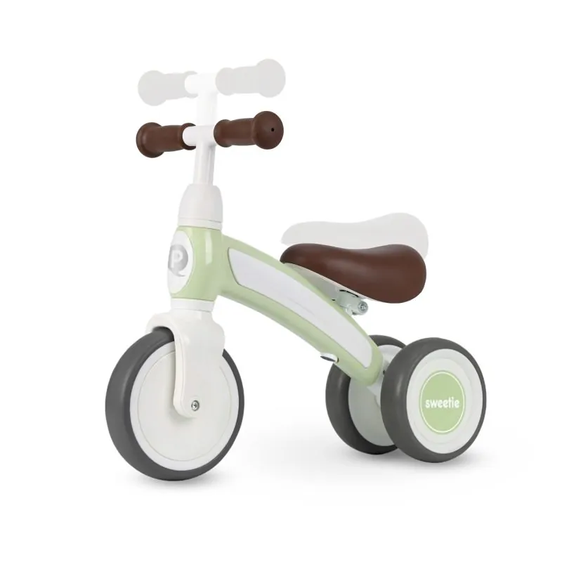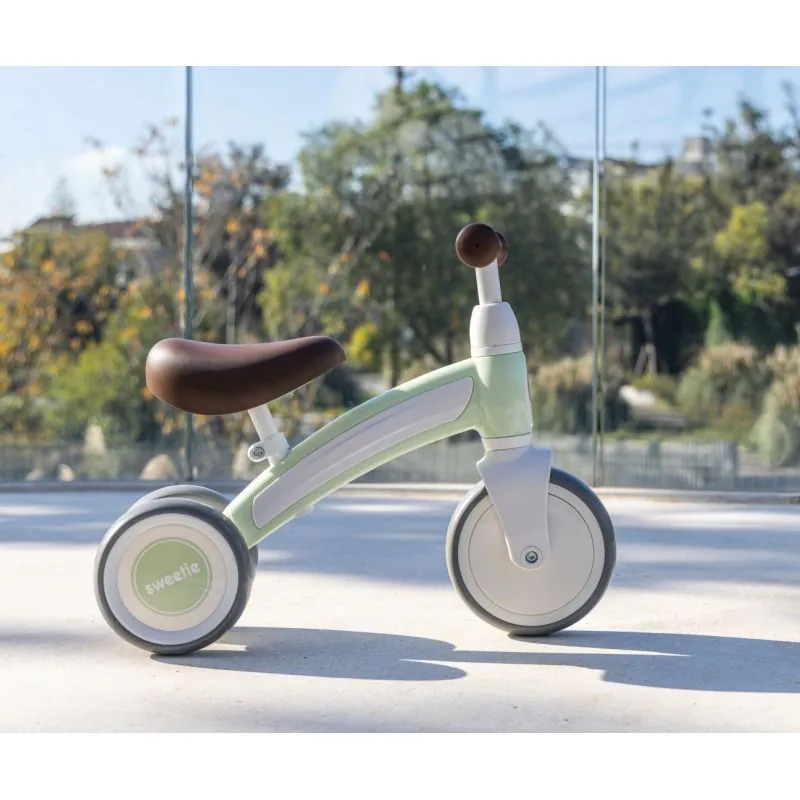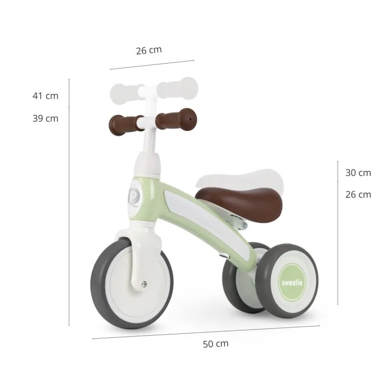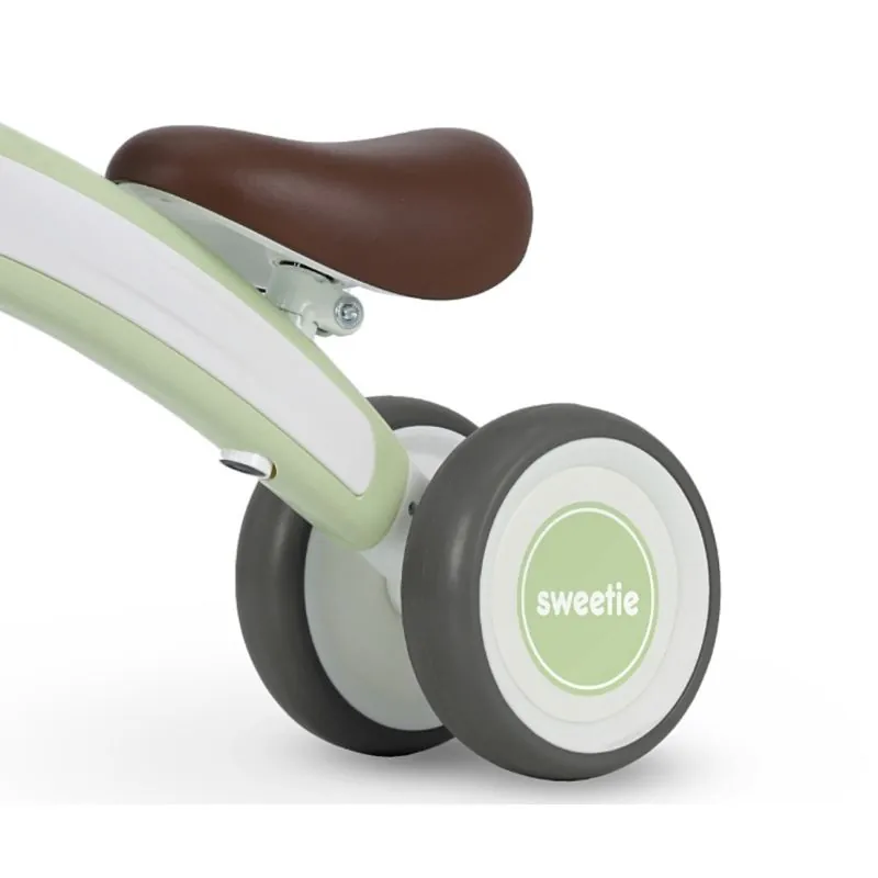 Sweetie aizmugurē ir dubultie riteņi – kopā 3, tie nodrošina izcilu stabilitāti.Riepas no EVA putām ir klusas un ļauj transportlīdzekli izmantot gan iekštelpās, gan ārā.Regulējams stūres augstums ļauj pielāgot transportlīdzekli bērna augumam.Vienkāršotā forma samazina gaisa pretestību, kas nozīmē lielāku braukšanas ātrumu.Mīksts un profilēts sēdeklis un neslīdoši rokturi nodrošina komfortu un ērtumu lietošanā. Tērauda rāmja konstrukcija un stūres sistēma ļauj izmantot bērniem, kuru svars ir līdz 20 kg.