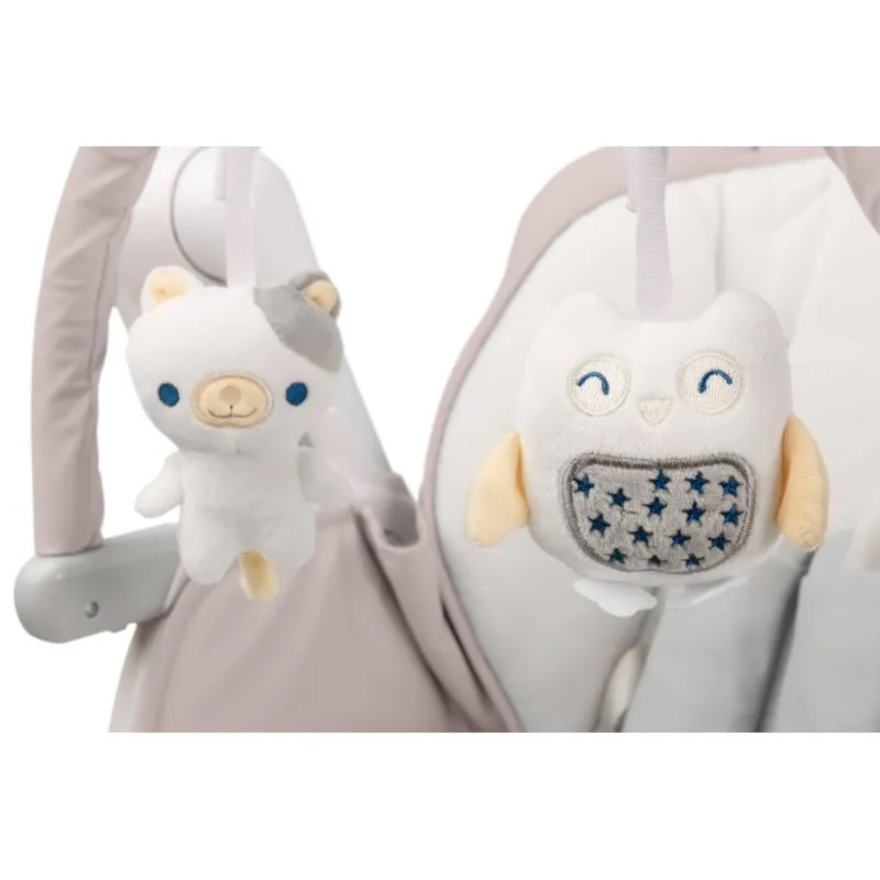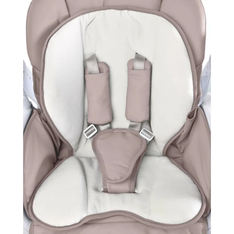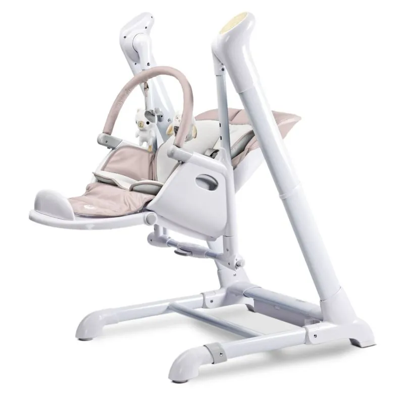Izmērs: 60x90x103 cm;Sēdekļa izmērs: 33x22 cm;Atzveltnes izmērs: 33x47 cm;Izmērs salocītā veidā: 58x60x110 cm;5 punktu drošības jostas;Regulējams atzveltnes un kāju balstu augstums, kā arī krēsla augstums;Izgatavots no mīksta PVC materiāla;Polsterējumi, melodijas;Nepieciešamas baterijas 4x1,5 V L14 (nav iekļautas) vai izmanto ar lādētāju (iekļauts);Svars: 14,1 kg;Regulējams šūpošanās ātrums un iespēja šūpot noteiktu laiku;Alumīnija rāmis;Noņemams paplāte.