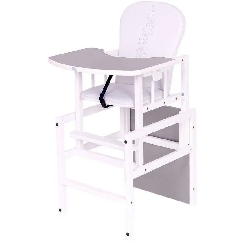 Barošanas krēsliņš izgatavots no priedes masīvkoka;Koka krēsliņš, bērnam augot, pārveidojas par galdiņu ar krēsliņu;Galdiņa virsmu var noņemt, atskrūvējot skrūves, varat būt pārliecināti, ka bērns neizstumj galda virsmu un neizkrīt no krēsliņa;Atverama drošības josta starp kājām;Viegli tīrāms pārvalks;Krēsliņš paredzēts lietošanai bērnam līdz 15 kg.;