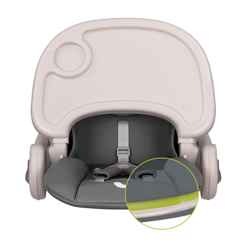 Piemērots bērniem no 6 mēnešiem līdz 3 gadiemĒrts, ergonomisks atzveltneAr polsterējumu integrēts spilvens bērna galvaiMīksti plecu spilventiņi3 pakāpju paplātes regulēšana2 pakāpju vertikāla kāju balsta regulēšanaĒrts un viegli tīrāms polsterējumsLiela, dubulta paplāte4 riteņi, kas neskrāpē grīduPusautomātiska izklāšanas sistēmaKompakts salocītās krēsla izmērsGalda mazgāšana trauku mazgājamā mašīnāPraktisks pakaramais paplāteiPlaša soma zem sēdekļa