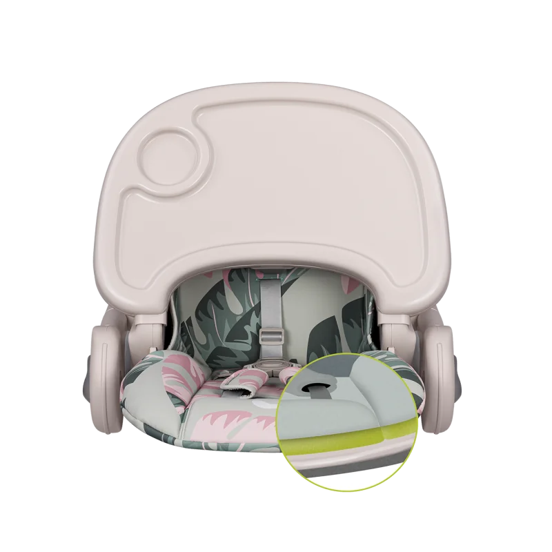 Piemērots bērniem no 6 mēnešiem līdz 3 gadiemĒrts, ergonomisks atzveltneAr polsterējumu integrēts spilvens bērna galvaiMīksti plecu spilventiņi3 pakāpju paplātes regulēšana2 pakāpju vertikāla kāju balsta regulēšanaĒrts un viegli tīrāms polsterējumsLiela, dubultā paplāte4 riteņi, kas neskrāpē grīduPusautomātiska izklāšanas sistēmaKompakts salocītās krēsla izmērsGalda var mazgāt trauku mazgājamā mašīnāPraktisks pakaramais paplāteiPlašs grozs zem sēdekļa