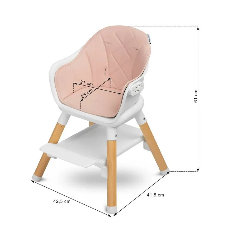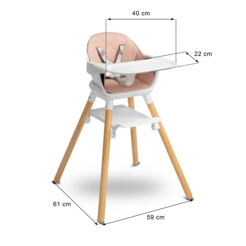 Mūsdienīgs, skandināvu dizains.Ilgmūžīga, izturīga konstrukcija.Augsts krēsliņš - lieliski piemērots mācīties ēst pie viena galda ar vecākiem.Zems krēsliņš - lieliski piemērots zīmēšanai, klucīšu kārtošanai vai rakstīšanas mācībām.Izturīga un augstas kvalitātes plastmasas, koka masīva un eko ādas konstrukcija.Maksimālā lietotāja slodze - 15 kg.5 punktu drošības jostas.Noņemams paplāte.Viegli tīrāms krēsliņa pārvalks.Divas augstuma pozīcijas.Atbilst standartam: 14988:2017+A1:2020