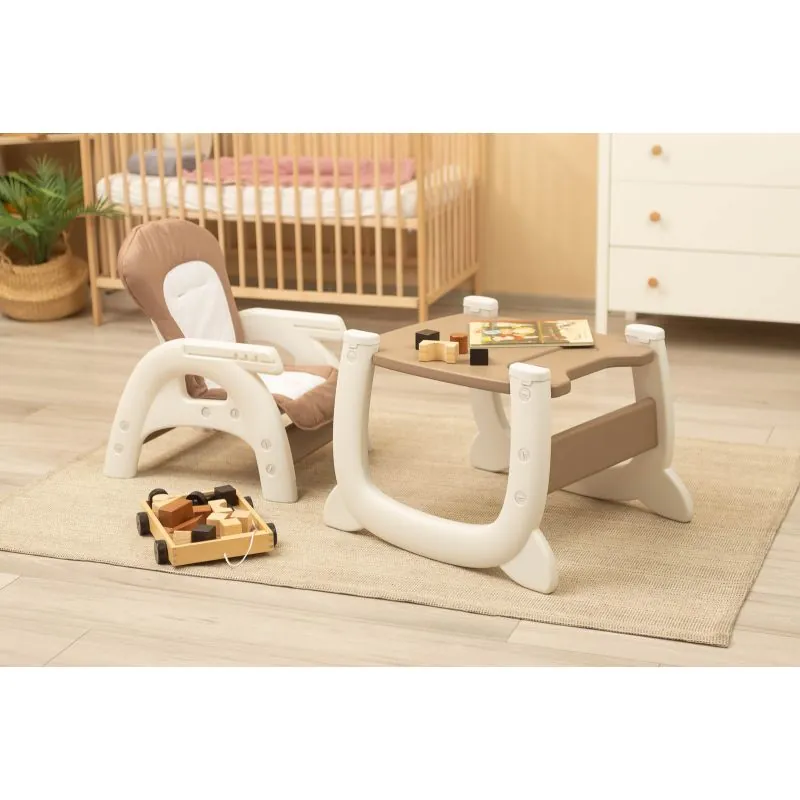Baro krēsls bez piepūles pārvēršas no augsta barošanas krēsla par galdu ar krēslu. Izturīga konstrukcija un ērta sēdvieta.