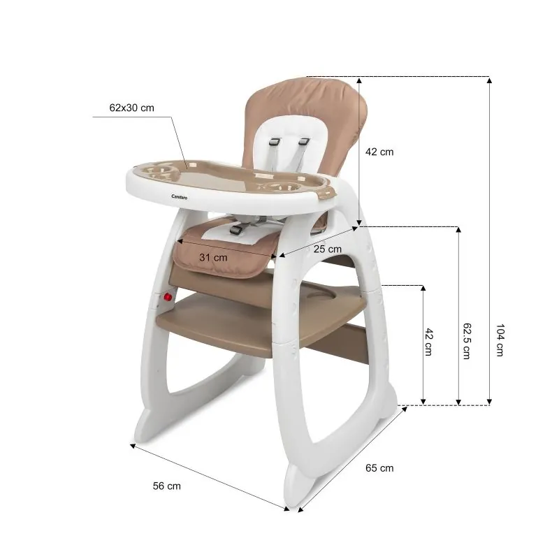 Šo kvalitatīvo, stabilo barošanas krēsliņu bez pūlēm pārveidosiet no augsta barošanas krēsliņa par galdiņu ar krēsliņu;Bērniem no 6 mēnešiem līdz 3-4 gadiem;Izgatavots no augstākās kvalitātes materiāliem;Regulējamas muguras atzveltnes pozīcijas;5 punktu drošības jostas;2 mazgājami noņemami paplātes ar krūzes turētāju;Krēsliņa pārvalks no izturīga auduma;Mīksts un ērts bērnam;Noapaļoti krēsliņa stūri aizsargā no sasitumiem;Pateicoties mazajam barošanas krēsliņa svaram, to ir viegli transportēt;Izmēri: 63x65x108 cm. (augsts krēsliņš), 55x46x62 cm. (krēsliņš), 44x55x65 cm. (galdiņš);Krēsliņa svars: 7,6 kg.