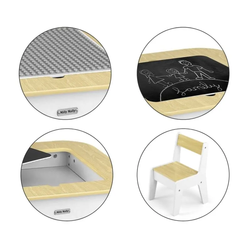 Modulārs bērnu mēbeļu komplekts: galds un 2 krēsli;Divpusējs galda virsma;2 krēsli, kurus var paslēpt zem galda virsmas;Liela uzglabāšanas nodalījums zem galda virsmas;Var zīmēt ar krītu abās galda virsmas pusēs;Profilētas atveres abās galda virsmas pusēs ļauj bērniem piekļūt uzglabāšanas nodalījumam;Vecums: 3–6 gadi;Materiāls: MDF;Krāsa: pelēka;Atbilst Eiropas drošības standartiem, lakots ar netoksiskām krāsām.
