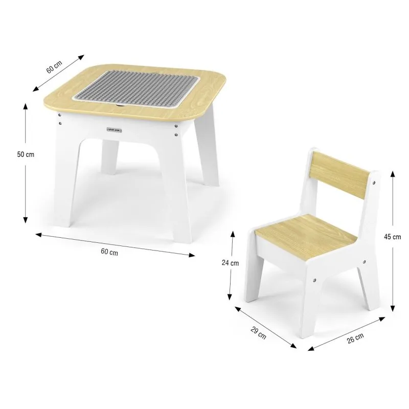 „Olaf Blocks“ bērnu mēbeļu komplekts – galds un divi krēsli – ir daudzfunkcionāls komplekts, kas izveidots, lai nodrošinātu komfortu un vietu radošām spēlēm un mācībām mazākajiem.