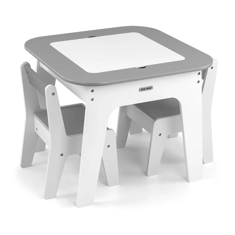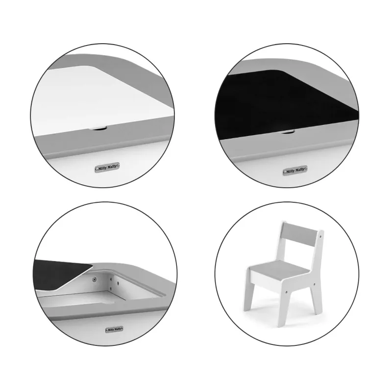 Modulārs bērnu mēbeļu komplekts: galds un 2 krēsli;Divpusējs galda virsma;2 krēsli, kurus var paslēpt zem galda virsmas;Liela uzglabāšanas kaste zem galda virsmas;Var zīmēt ar krītu uz abām galda virsmas pusēm;Profilētas atveres abās galda virsmas pusēs ļauj bērniem piekļūt uzglabāšanas kastei;Vecums: 3–6 gadi;Materiāls: MDF;Krāsa: pelēka;Atbilst Eiropas drošības standartiem, lakots ar netoksiskām krāsām.