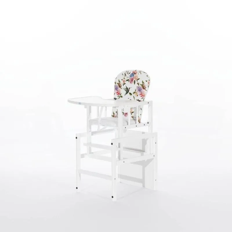 Barošanas krēsliņš izgatavots no priedes masīvkoka;Koka krēsliņš, bērnam augot, pārveidojas par galdiņu ar krēsliņu;Galdiņa virsmu var noņemt, atskrūvējot skrūves, varat būt pārliecināti, ka bērns neizstumj galda virsmu un neizkrīt no krēsliņa;Atverama drošības josta starp kājām;Viegli tīrāms pārvalks;Krēsliņš piemērots lietošanai bērnam līdz 15 kg.;