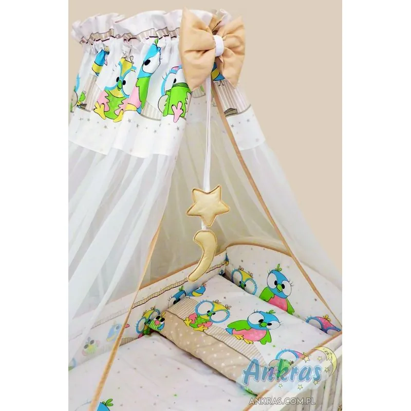 Baldahīns no tilla;Segas pārvalks 120/90 cm.;Spilvens 40/60 cm.;Segas pārvalks 120/90 cm.;Spilvendrāna 40/60 cm.;Gultas malas aizsardzība 360 cm. (visapkārt gultas perimetram).