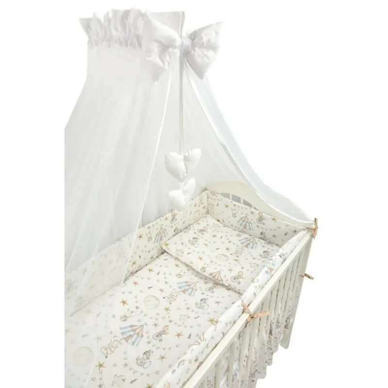 Baldahīns no tilla.;Segas pārvalks 120/90 cm.;Spilvens 40/60 cm.;Segas pārvalks 120/90 cm.;Spilvendrāna 40/60 cm.;Gultas malas aizsargs 360 cm. (visapkārt gultas perimetram).