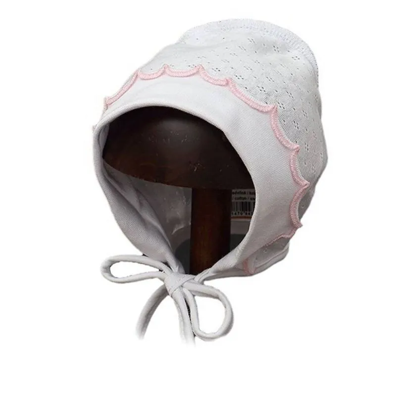 Kokvilnas cepurīte zīdaiņiem, ar aukliņām. Apgrieztas šuves.Izgatavots no sertificētas un mīkstas 100% kokvilnasKrāsa: baltaRažots Lietuvā