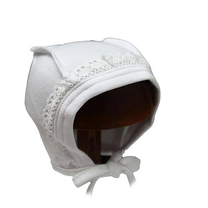 Kokvilnas cepurīte zīdaiņiem, ar aukliņām. Apgrieztas šuves.Izgatavots no sertificētas un mīkstas 100% kokvilnasKrāsa: baltaRažots Lietuvā