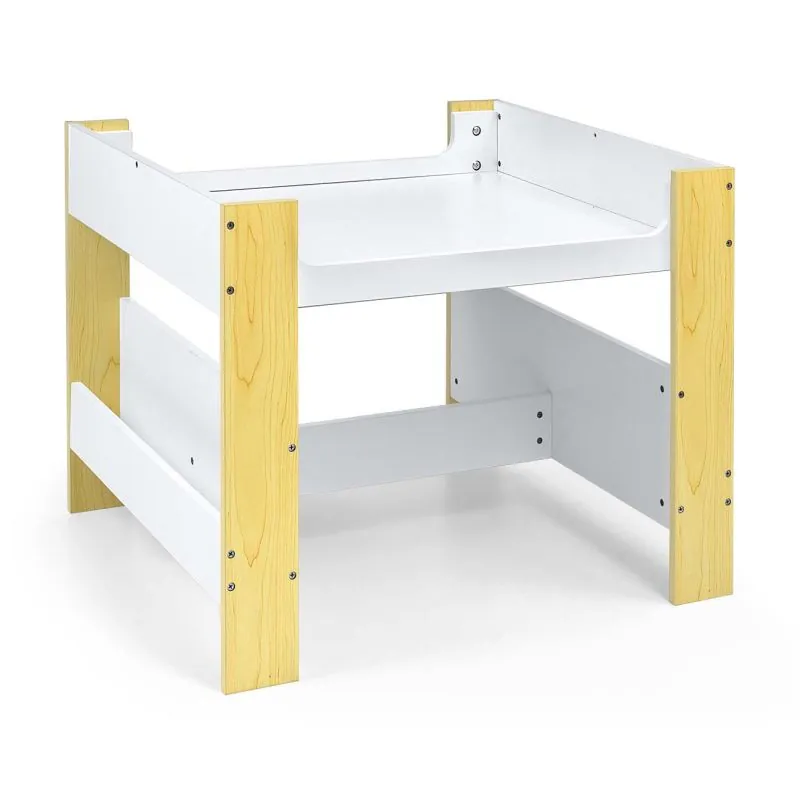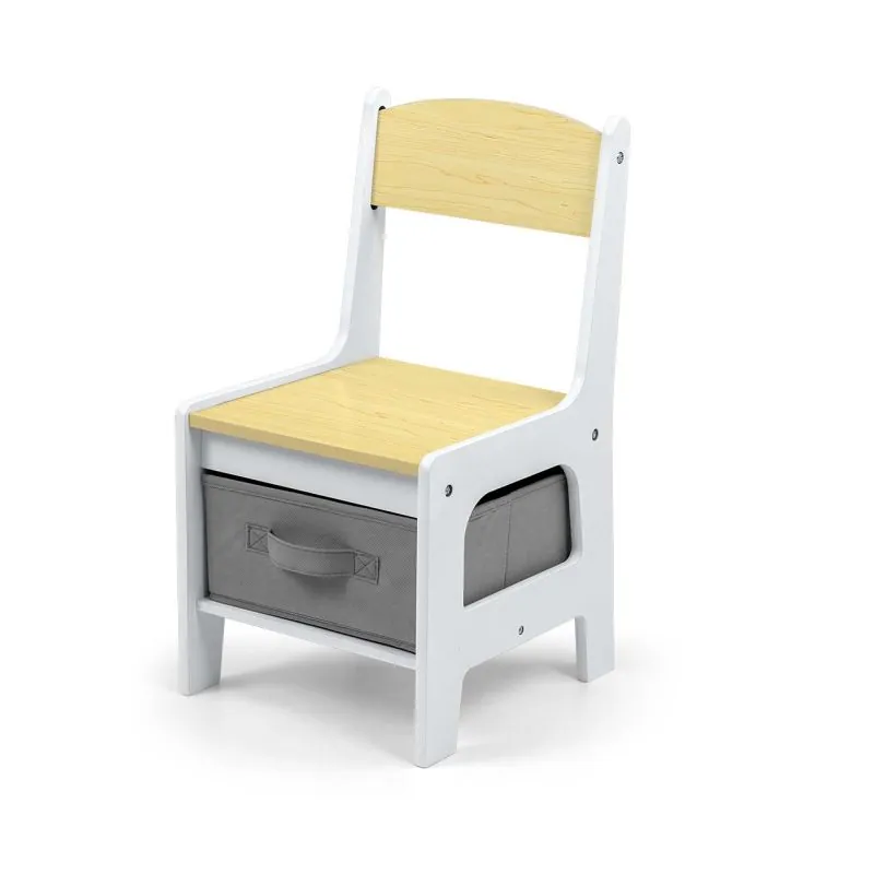 Bērnu daudzfunkcionālo mēbeļu komplekts: galds un divi krēsli ar tekstila glabāšanas kastēm. Ieteicams bērniem no 2 gadu vecuma