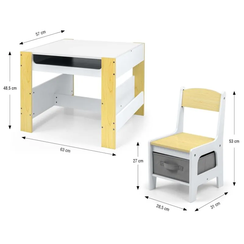 Izveidots tā, lai bērniem būtu ērti: komforts, telpa radošai spēlei, gleznošanai, rakstīšanai un maksimāls komforts nodarbību laikā;Galds ar lielu uzglabāšanas kasti zem divpusēja noņemama virsmas. Tāpat arī sānu plaukti;Viena galda virsmas puse ir liela zīmēšanas tāfele;Krēsli ir viegli, tāpēc bērni tos viegli pacels;Ļoti rūpīgi un kvalitatīvi izgatavotas mēbeles;Abiem krēsliem ir noapaļoti stūri, lai bērni spēlētos droši;Visi galda un konstrukcijas elementi nodrošina augstu stabilitāti un samazina krišanas risku;Komplekts izgatavots no MDF plātnes, ir izturīgs un viegli kopjams;Mēbeles ir viegli salikt, un visi montāžai nepieciešamie elementi ir iepakojumā;Smalkas uzglabāšanas kastes zem krēsliem bērna mantām;