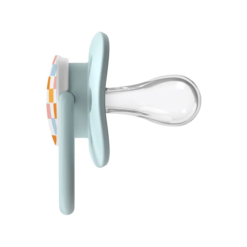 Simetriski knupīši: nav svarīgi, kuru pusi ievietosiet bērnam mutē. Mīksti, silikona, ļoti plāni, lai nebojātu sakodienu. Plastmasas disks ar caurumiem, lai cirkulētu gaiss un nekairinātu ādu ap muti. Ar aizsargvāciņiem. Paredzēti bērniem no dzimšanas līdz 6 mēnešiem.