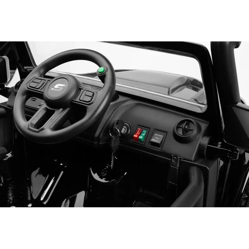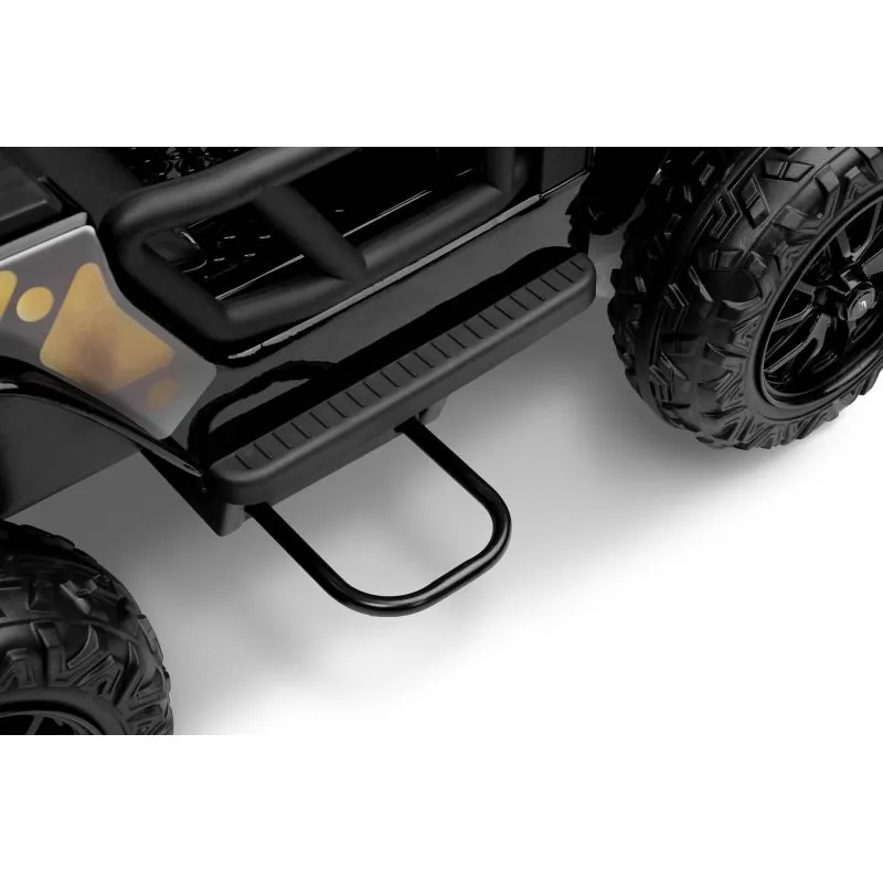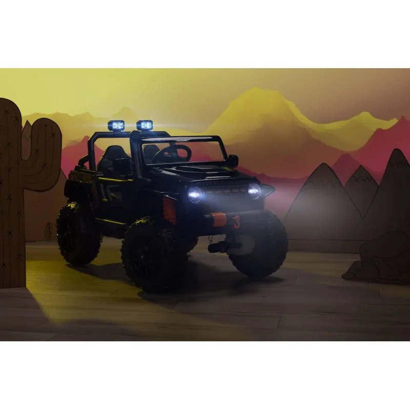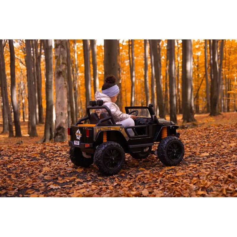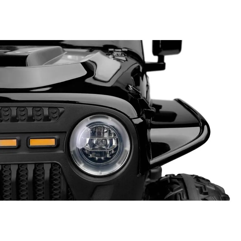 Ringo ir apvidus auto ar akumulatoru, iedvesmots no ikoniskā Jeep Wrangler. Braukšanu bezceļos atvieglo 4 jaudīgi motori, kas piedzen katru riteni atsevišķi.18 centimetru klīrenss un 30 centimetru riepas ar lielu protektoru no EVA putām. Braukšanas komfortu nodrošina aizmugurējās ass amortizatori. Ērts eko ādas sēdeklis.Mūzikas panelis ar bluetooth un usb.Šī modeļa lakotais korpuss palielina estētisko vērtību. Vakara braucienu dažādos LED priekšējie lukturi un 2 priekšējie lukturi, kas uzstādīti uz šķērssijas. Izvelkamie pakāpieni atvieglo iekāpšanu mazākiem bērniem. Braukšanu ar tālvadības pulti var kontrolēt vecāki.3 punktu drošības josta.Automātiskā bremze.2 ātruma režīmi.Atveramas durvis.Salokāmi spoguļi.LED lukturi: priekšējie un papildu uz šķērssijas.Aizmugurējā bagāžnieka atvere.Stūre ar skaņas signālu un pogām, kas atskaņo melodijas.Izcilā jauda, pateicoties četriem 12 V motoriem (45 W).Skaidras instrukcijas un vienkārša montāža.Vecuma diapazons: 3-8 gadiIzmēri: 122x70x72 cmSvars: 22 kgSvara limits: 100 kgBarošana: 4 x 45W 12V motors (kopā 180W)1 x akumulators (10Ah 12V)Sēdekļa izmēri: 43x19x23 cmIepakojuma izmēri: 114 x 63 x 38 cm
