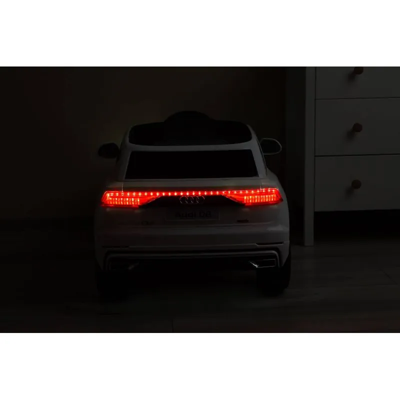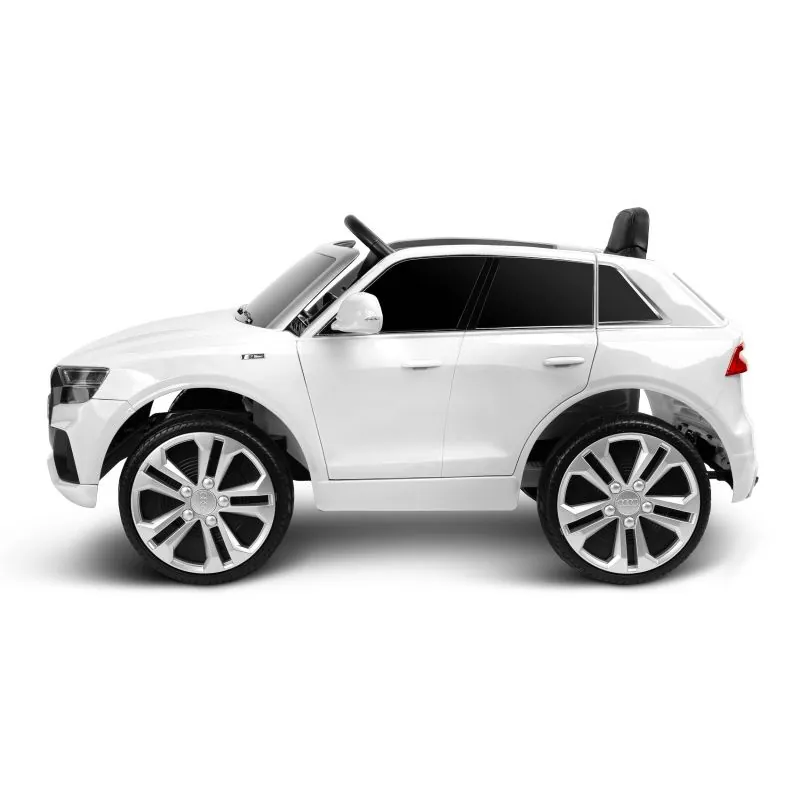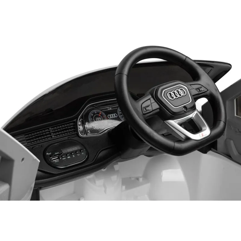 Automašīna ne tikai nodrošinās daudz izklaides, bet arī palīdzēs attīstīt mazuļa motoriskās prasmes un koordināciju. Audi licence garantē augstu kvalitāti un precizitāti. Toyz Audi Q8 ir divi 45W motori, 12V, 4Ah akumulators.Bērns var vadīt elektromobili pats vai ļaut to kontrolēt ar pulti vecākiem.Atveramas automašīnas durvis.Lēnas palaišanas funkcija.Iespēja braukt uz priekšu un atpakaļ.LED lukturi: priekšā un aizmugurē.Ātrums 3-5 km/h, regulējams.Plata vadītāja sēdvieta pārklāta ar eko ādu.Riteņi izgatavoti no EVA putām.Viegli pārnēsājams, paslēpta roktura.Apgaismots multimediju panelis ar AUX (mini ligzda), USB, microSD.Stundas lietošana pēc pilnas uzlādes.Izņēmuma jauda, pateicoties diviem 12 V motoriem (kopējā jauda 45 W).Skaidras instrukcijas un viegla montāža.