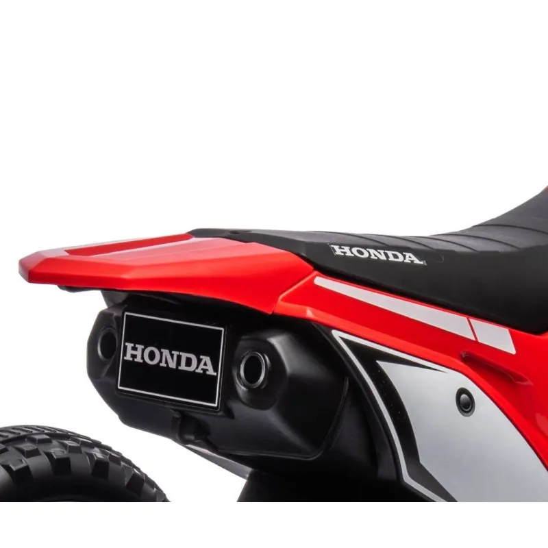 Licencēts transportlīdzeklis-Honda CRF;Trīsritenis, tāpat kā tā prototips, ir sportiska dizaina un plēsīga rakstura kombinācija;Transportlīdzeklis tika izgatavots, ņemot vērā vismazākās detaļas no augstākās kvalitātes materiāliem, kas izceļas ar lielu izturību un drošību;Nospiežot akseleratora pedāli, trīsritenis kustas;Lieli, plati riteņi ar bezceļu protektoru nodrošinās mobilitāti ceļojumos ārpus mājas;Profilēts sēdeklis – pietiekams komforts un drošība pašiem mazākajiem lietotājiem;Savukārt tērauda riteņu asis garantē trīsriteņa stabilitāti un ilgmūžību;Braucot bērns attīstīs savas roku prasmes, orientāciju kustībā, motoriku;Izstrādājuma lietošana pieaugušā uzraudzībā;Konturēts sēdeklis;Rotējošs aizmugurējais ritenis;Atļautā slodze: 25 kg;Paredzēts bērniem no 2 gadiem;CE drošības sertifikāts;Barošana - baterija (iekļauta komplektā);Lādētājs;Ātrums 2,5-3 km/h;30W motors;6v4,5Ah baterija;Pilnīga akumulatora uzlāde ilgst apmēram 8 stundas;Garums: 70 cm;Kopējais augstums: 50 cm;Platums: 38,5 cm;Augstums līdz kāju balstam: 9,5 cm;Sēdekļa izmēri: 10 x 27 cm;Augstums līdz sēdeklim: 27 cm;Kāju balsta izmēri: 9 x 18 cm;Stūres platums: 36,5 cm;Riteņa diametrs: 19 cm;Augstums no kāju balsta līdz sēdeklim: 21 cm;