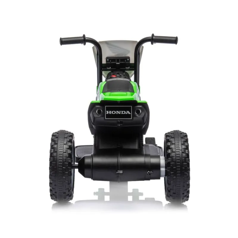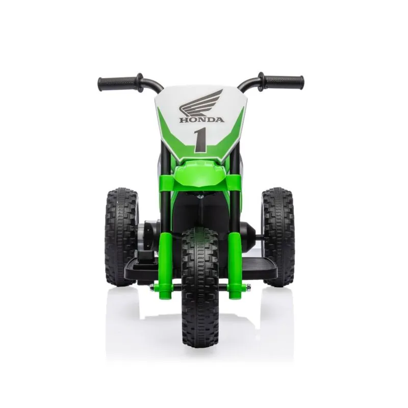 Licencēts transportlīdzeklis-Honda CRF;Trīsritenis, tāpat kā tā prototips, ir sportiska dizaina un plēsīga rakstura kombinācija;Transportlīdzeklis tika izgatavots, ņemot vērā vismazākās detaļas no augstākās kvalitātes materiāliem, kas izceļas ar lielu izturību un drošību;Nospiežot akseleratora pedāli, trīsritenis pārvietojas;Lieli, plati riteņi ar bezceļa protektoru nodrošinās mobilitāti ceļojumos ārpus mājas;Profilēts sēdeklis – pietiekams komforts un drošība pašiem mazākajiem lietotājiem;Savukārt tērauda riteņu asis garantē trīsriteņa stabilitāti un ilgmūžību;Braucot bērns attīstīs savas roku prasmes, orientāciju kustībā, motoriku;Produkta lietošana pieaugušā uzraudzībā;Konturēts sēdeklis;Rotējošs aizmugurējais ritenis;Atļautā slodze: 25 kg;Paredzēts bērniem no 2 gadiem;CE drošības sertifikāts;Barošana - baterija (iekļauta komplektā);Lādētājs;Ātrums 2,5-3 km/h;30W motors;6v4,5Ah baterija;Pilnīga akumulatora uzlāde ilgst apmēram 8 stundas;Garums: 70 cm;Kopējais augstums: 50 cm;Platums: 38,5 cm;Augstums līdz kāju balstam: 9,5 cm;Sēdekļa izmēri: 10 x 27 cm;Augstums līdz sēdeklim: 27 cm;Kāju balsta izmēri: 9 x 18 cm;Stūres platums: 36,5 cm;Riteņa diametrs: 19 cm;Augstums no kāju balsta līdz sēdeklim: 21 cm;