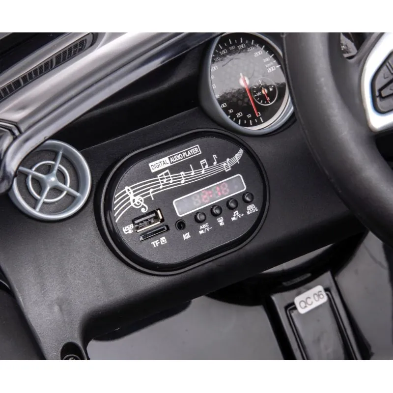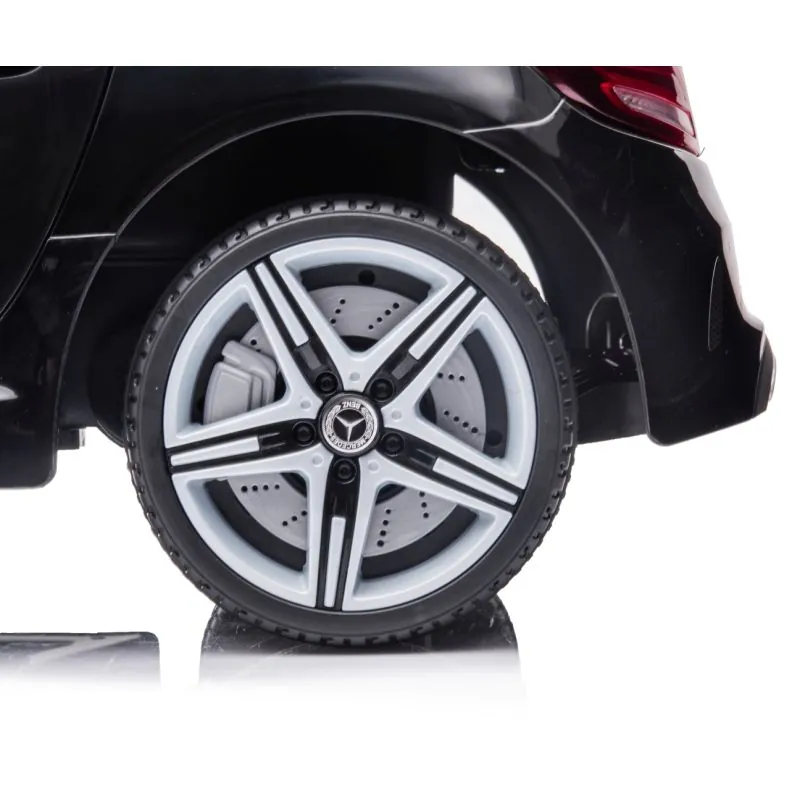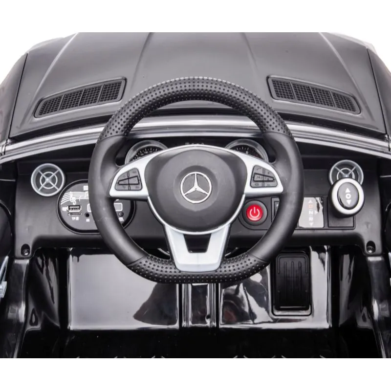 Mercedes-Benz licencēta automašīna, kuras izstrādē pievērsta liela uzmanība sīkākajām detaļām un izmantoto materiālu kvalitātei;Automobilis iedarbojas, nospiežot START pogu;Instrumentu panelī ir pulksteņa imitācija, multivides vadības panelis (skaļuma regulēšana, USB un SD kartes savienojumi);Labajā stūres pusē ir ātruma vadības svira: ,,Low speed" un ,,High speed", kā arī pārnesumu svira (braukšana uz priekšu, neitrāla pozīcija un atpakaļgaita);Mercedes-Benz var vadīt ar tālvadības pulti vai bērns var vadīt pats, izmantojot stūri un pedāli. Tā attīstās patstāvības un atbildības prasmes;Noņemot kāju no pedāļa, automašīna apstājas pati;Tālvadības pultij ir šādas funkcijas: aizslēgt automašīnu - P, iestatīt 1 no 3 ātruma līmeņiem - S, apgriezties un braukt uz priekšu un atpakaļ;Lai savienotu automašīnu ar vadības pulti, turiet pogu ,,M" 2-4 sekundes;2 motori pa 30W;2 6V4,5Ah baterijas (uzlādes laiks apmēram 8 stundas);Braukšanas laiks apmēram 1 - 2 stundas, atkarībā no virsmas veida;2 ātruma līmeņi;AUX, USB, SD slots;Multivides panelis;Spīdoši lukturi automašīnas priekšpusē;Aizmugurējā riteņu ass ar atsperu amortizatoriem, tāpēc braukšana būs vēl mīkstāka un ceļa nelīdzenumi nebūs jūtami;Regulējams braukšanas ātrums 2-4,3 km/h;Drošības jostas;Vietu skaits: 1;Stūrē iebūvēts skaņas signāls un 5 melodijas;Atveramas durvis, tāpēc bērnam būs ērti iekāpt un izkāpt;Sānu spoguļi;Automātiskā bremzēšanas funkcija - automašīna apstājas, kad noņem kāju no ātruma pedāļa;Maksimālais svars līdz 30 kg.;DC 12V500Ah lādētājs;Lādētājs;Transportlīdzeklis paredzēts bērniem no 3 gadu vecuma.
