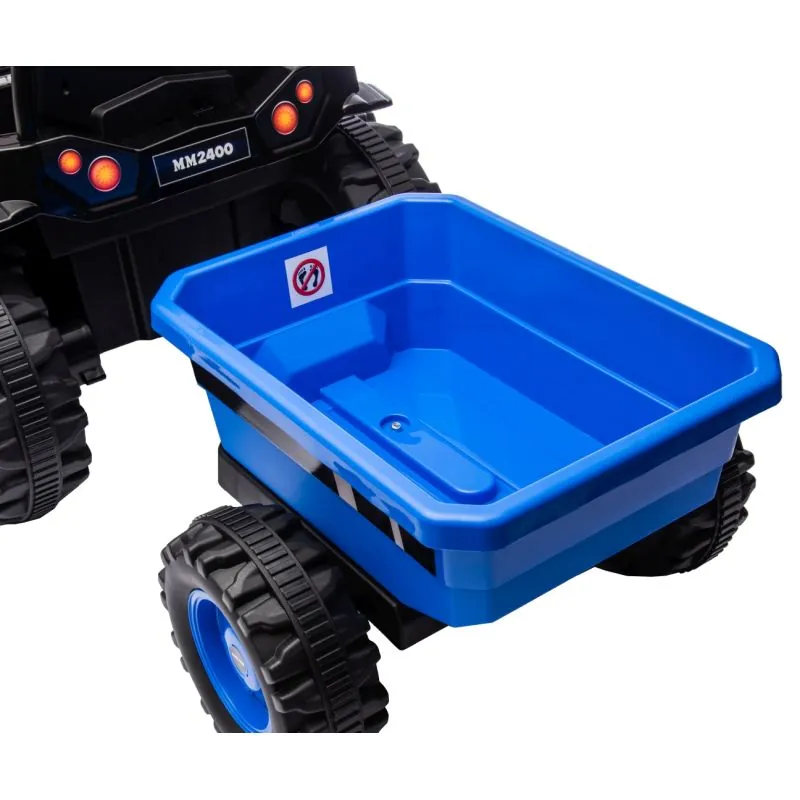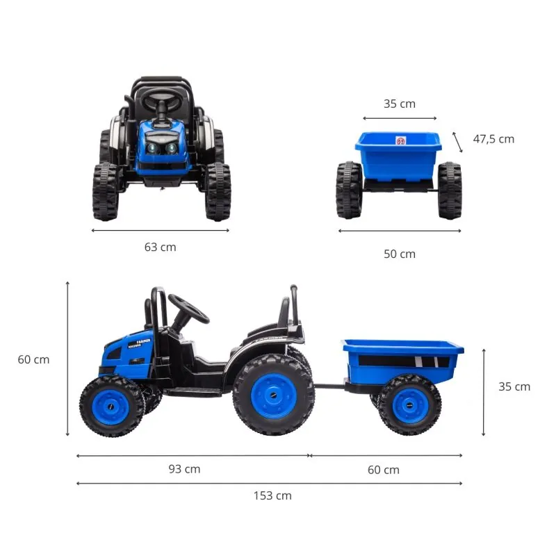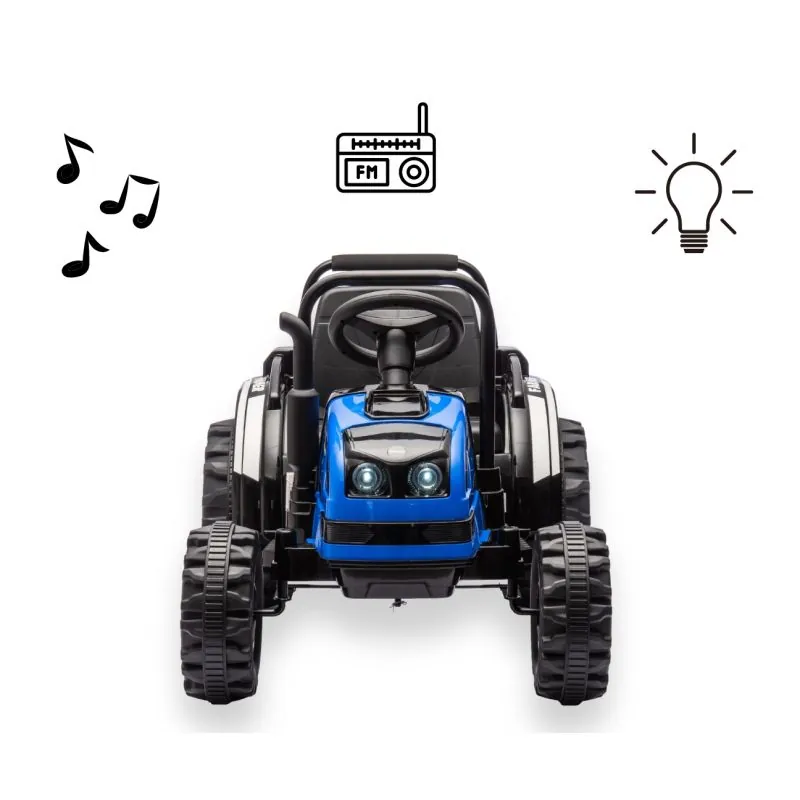Ieteicams bērniem no 3 gadu vecuma;Traktoram ir piekabe, kas piešķir vēl vairāk rotaļīguma;Metāla aizsargstieņi priekšā un aizmugurē;Skursteņa izplūdes caurules imitācija, traktora motora rūkoņa - tas viss ļauj mazajiem zemniekiem iegrimt fantāzijā;Barošanas slēdzis ieslēdz traktora motora rūkoņu;Divi motori ļauj sasniegt 3-5 km/h ātrumu;Traktors nodrošina drošu un vienmērīgu braukšanu;Inovatīva šarnīra stūrēšanas sistēma kopā ar vadāmo priekšējo asi;Attīsta smalko motoriku un roku un acu koordināciju;Aizmugurējais āķis paredzēts piekabes piestiprināšanai, kas sniedz vairāk iespēju jautri pavadīt laiku;Augstas kvalitātes materiāli un pievilcīgs izskats;Mūzikas panelis: radio, MP3, USB Bluetooth;Produkts tiek izmantots pieaugušo uzraudzībā;2 x 35W 12V motori;Atverams pašizgāzējs;Spīdoši lukturi priekšā un aizmugurē;Riepas ar bezceļa protektoru;Riteņu diametrs 31 cm;Akseleratora pedālis;Pārnesumi: Uz priekšu, atpakaļ un neitrāls;Lēnas un ātras braukšanas slēdzis;Maksimālā slodze 30 kg;Tālvadības pults.