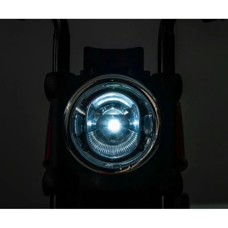 Start/Stop poga;Pārnesumi: uz priekšu, atpakaļ un neitrāls;Spīdošs priekšējais lukturis;Metāla riteņu asis;Sānos uzstādīti spoguļi;Ērts sēdeklis;Akseleratora pedālis;Plastmasas riteņi ar protektoru;Uzlādējams akumulators;Ātrums: 1-3 km/h;Motora jauda 15W.Maksimālā slodze 25 kg.;CE drošības sertifikāts;