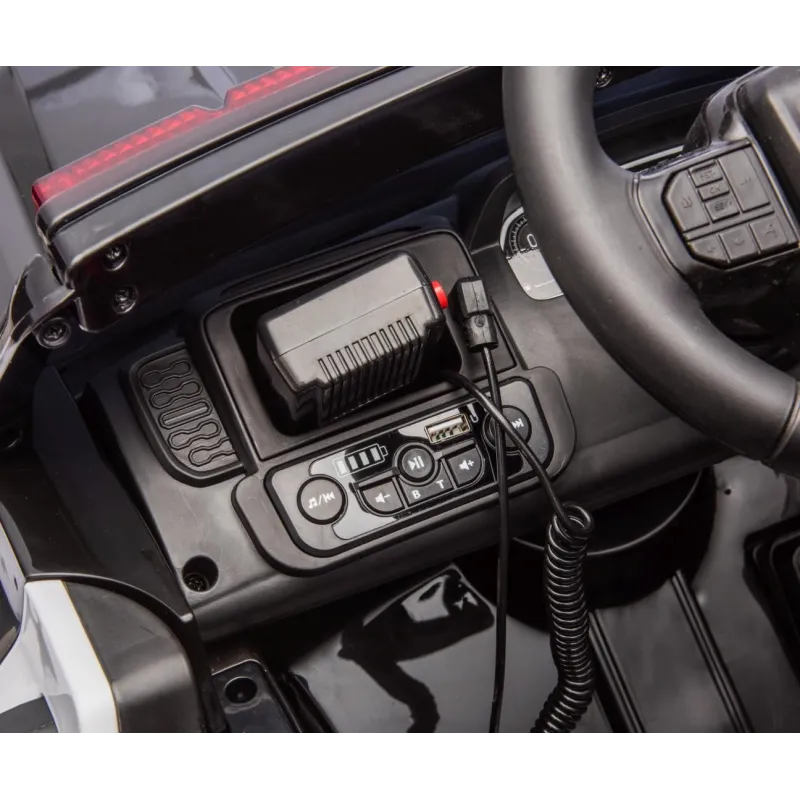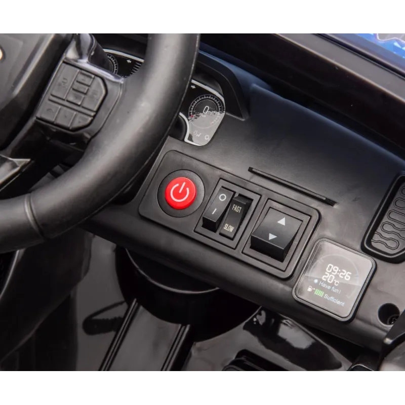 EVA putu riteņi ar protektoru (25 cm diametrs);Tālvadības pults (izmēri 14 x 10 x 4 cm);R/C 2.4G tālvadības pults (2 AAA/LR03 baterijas - nav iekļautas);STOP funkcija tālvadības pultī;2 x 39 W motori;12 V 4,5 Ah akumulators;Apgaismots START slēdzis;Akumulatora uzlādes indikators;Akumulatora uzlādes laiks: 9–10 stundas (līdz pilnai uzlādei);Braukšanas laiks: 1–2 stundas (atkarībā no virsmas);Mūzikas pults (USB, MP3, BLUETOOTH);Stūre ar skaņām;Lēna/gluda iedarbināšana;3 ātrumi uz priekšu;Atpakaļgaitas ātrums;Aizmugurējo riteņu piekare;Ātrums 3–5 km/h.;Priekšējais LED apgaismojums;Priekšējā stikla apgaismojums – zilas un sarkanas LED policijas signāli;Megafons/„bumbieris“ – nedaudz pastiprināta balss;Atveramas durvis;Kontūrēts sēdeklis (29,5 x 33 x 19,5 cm.);Drošības josta;Iekraušanas vieta aiz sēdekļa (38 x 10,5 x 16 cm.);Lādētājs;Vecuma grupa: 3+;Maksimālā slodze: līdz 30 kg.;Atbilst Eiropas drošības standartiem;Svars: 14,1 kg.
