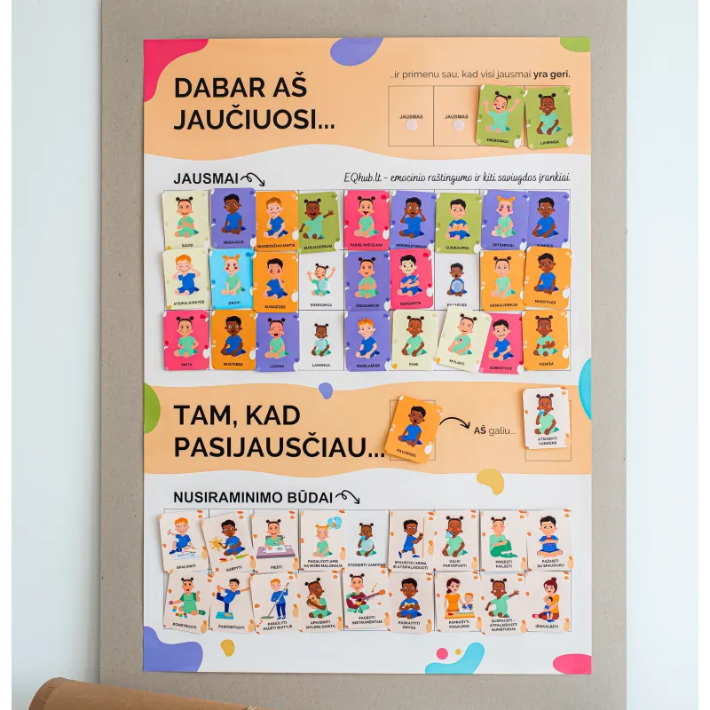 Emociju kartītes ir laminētas emociju atpazīšanas un nomierināšanās veidu kartītes bērna emocionālās inteliģences attīstīšanai.