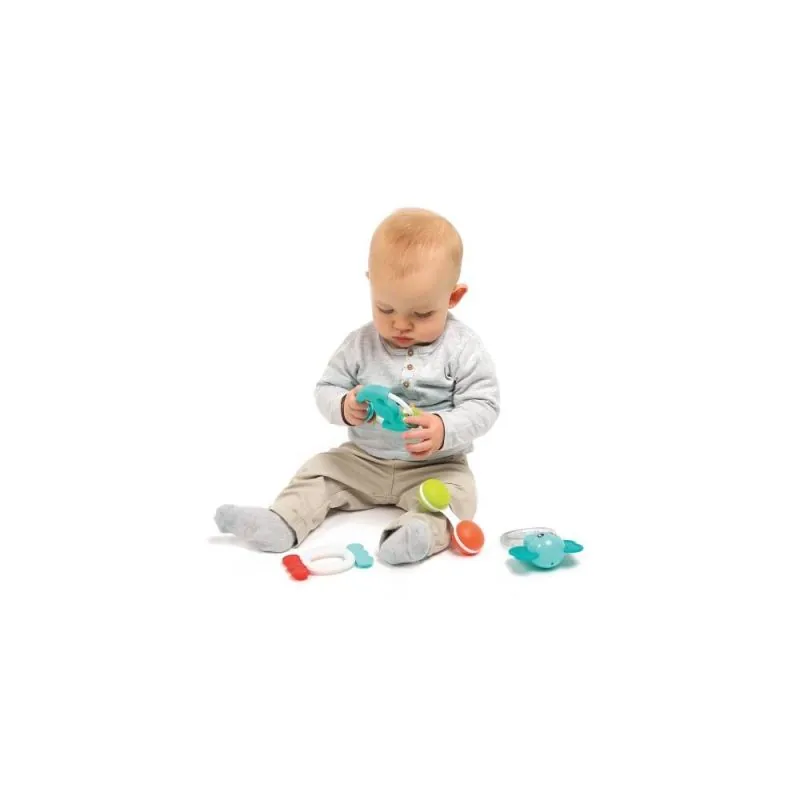 4 grabulīšu komplekts - lieliski piemērots agrīnās smalkās motorikas prasmju attīstīšanai.Grabulīši ir viegli, ērti, piemēroti mazuļu rociņām.Spilgtas krāsas un grabējošas pērlītes piesaista un palīdz noturēt mazuļa uzmanību.Grabulīši ir izturīgi, silikona grabulīšu daļas ir piemērotas košļāšanai.Grabulīši izgatavoti no plastmasas un silikona.