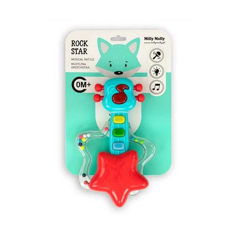 Milly Mally muzikālā ģitāra spēlē 6 interesantas melodijas un tai ir gaismas efekti. Nospiežot augšā esošo muzikālās nots formas pogu, varat mainīt režīmus no mūzikas uz instrumenta režīmu.