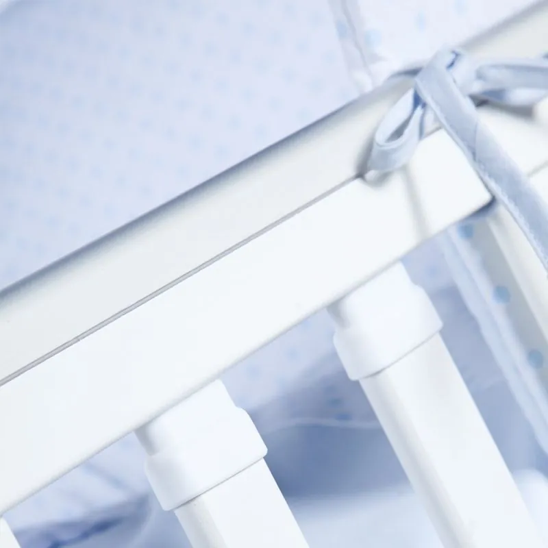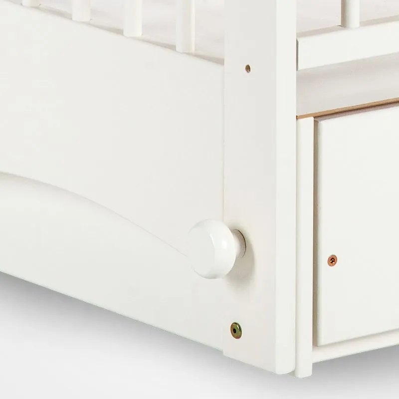 Iekšējie izmēri: 120x60 cm;Krāsa balta, netoksiskas krāsas;Jauna šūpoļu tehnoloģija ar bloķēšanas funkciju;Iebūvēts slēgts atvilktne priekšmetiem;Izgatavots no priedes masīva un plātnes;Trīs augstumu regulējams dibens;Plastmasas aizsargi uz gultiņas malām - margas;Nolaižama sāna;Kociņi neizņemami;