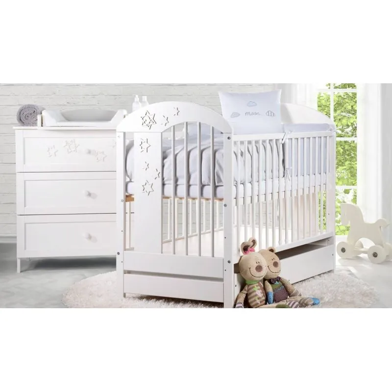 Bērnu gultiņš Klupš Radek ar zvaigznītēm, atvilktni, izņemamiem stieņiem un 3 augstuma līmeņu dibenu