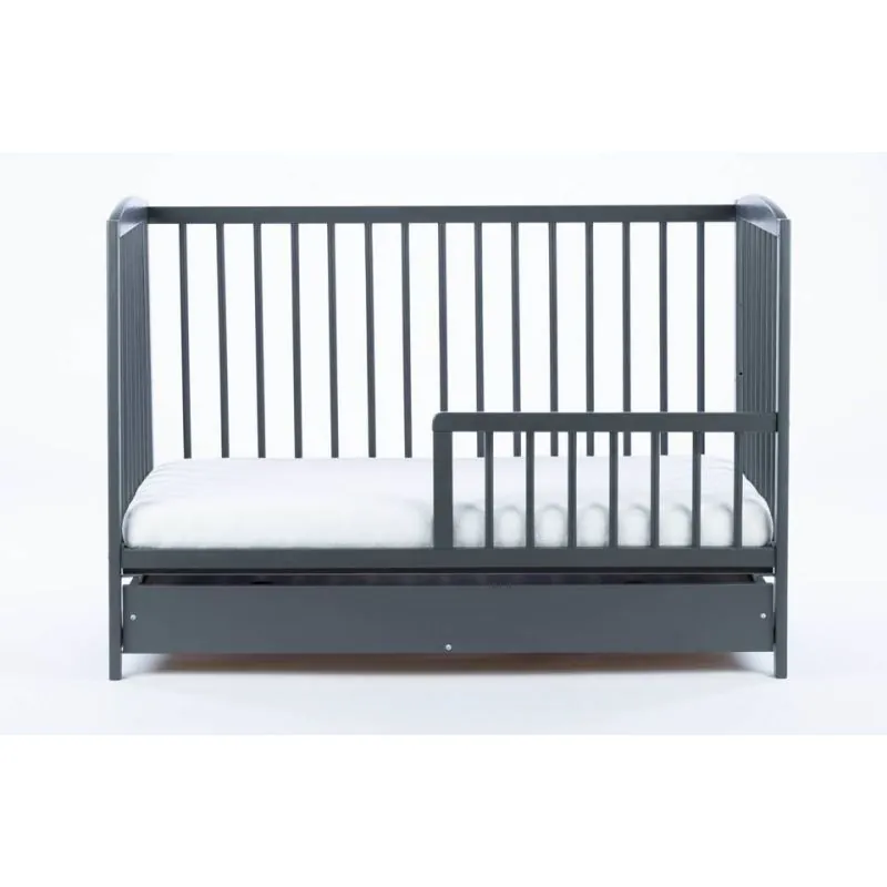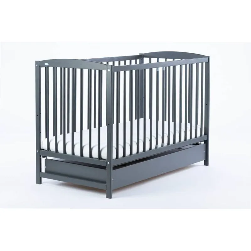 Priežu gultiņa;Tumši pelēka krāsa;Apaļie stieņi nodrošinās bērna drošību;Regulējams 3 pozīciju grīdas augstums;Izņemami stieņi, lai bērns varētu pats iekāpt/izkāpt no gultiņas;Noņemama sāna, kas ļaus gultiņu izmantot arī lielākam bērnam.Ar atvilktni.Matraču gultiņai varat izvēlēties ŠEITIekšējie izmēri: 120 x 60 cm.Ārējie izmēri 124 x 65 x 100 cm.