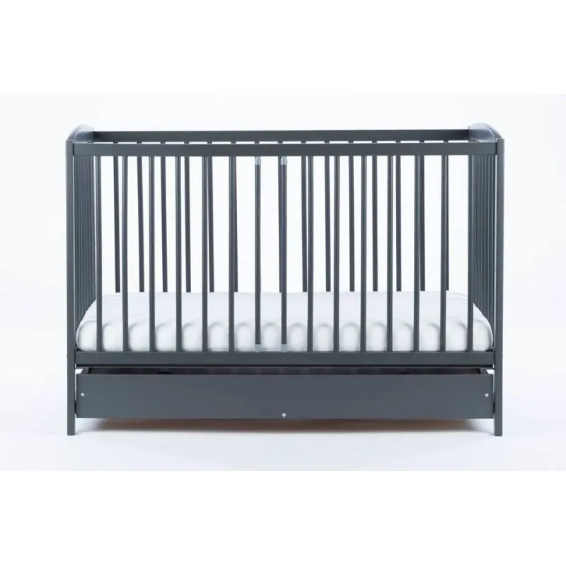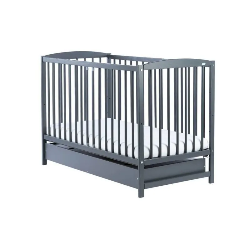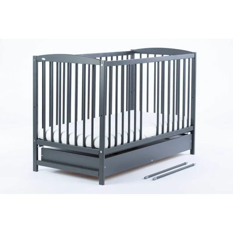 Priežu gultiņa;Tumši pelēka krāsa;Apaļie stieņi nodrošinās bērna drošību;Regulējams 3 pozīciju grīdas augstums;Izņemami stieņi, lai bērns varētu pats iekāpt/izkāpt no gultiņas;Noņemama sāna, kas ļaus gultiņu izmantot arī lielākam bērnam.Ar atvilktni.Matraču gultiņai varat izvēlēties ŠEITIekšējie izmēri: 120 x 60 cm.Ārējie izmēri 124 x 65 x 100 cm.