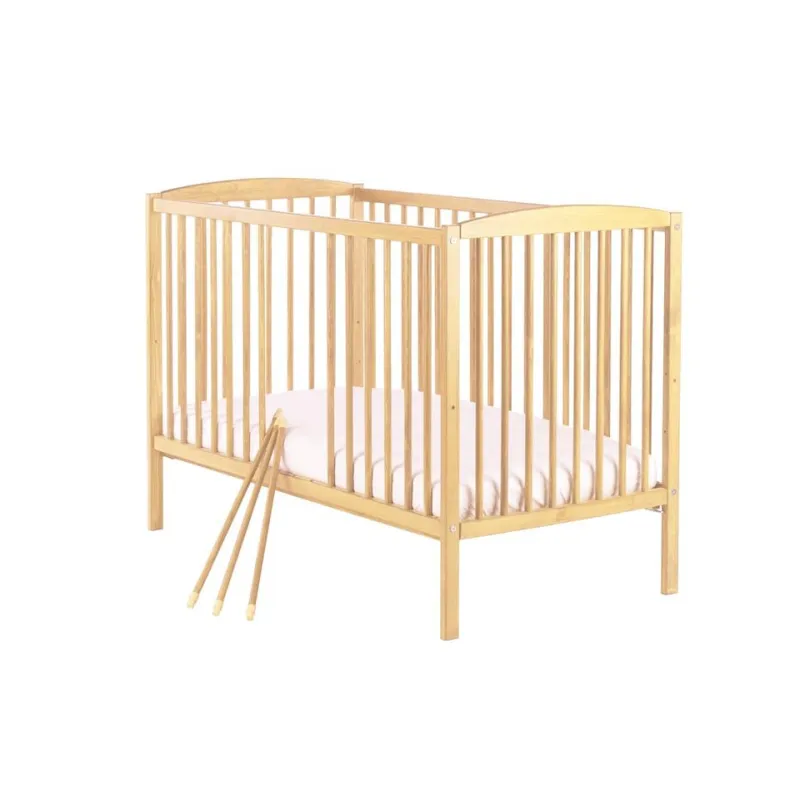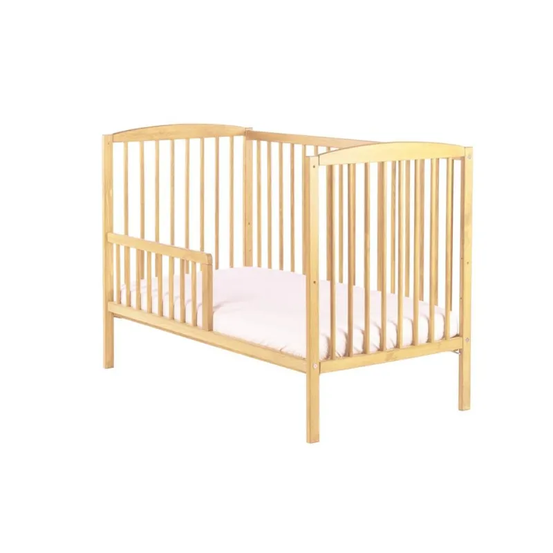 Priežu masīvkoka gultiņa;Apaļi 16 mm diametra stieņi, 5,5 cm attālumā viens no otra.Stieņi nodrošinās bērna drošību;Regulējams dibena augstums (3 pozīcijas);Noņemama sānu mala.Izņemami stieņi, lai pieaudzis bērns varētu pats iekāpt/izkāpt no gultiņas;Matraču gultiņai varat izvēlēties ŠEIT