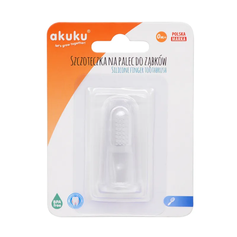 Akuku silikona zobu birste ir pirkstis no augstas kvalitātes silikona (bez BPA), ar maigiem sariem, uzvelkams uz rādītājpirksta, viegli mazgājams, paredzēts zobu tīrīšanai un smaganu masāžai, tādējādi mazina augošo zobu izraisītās sāpes.