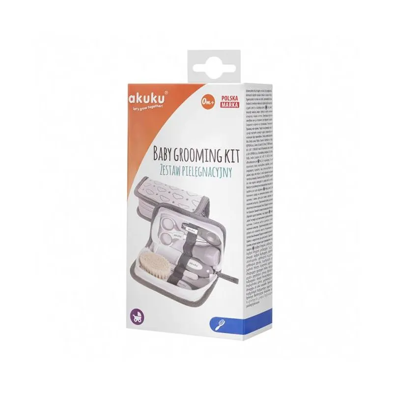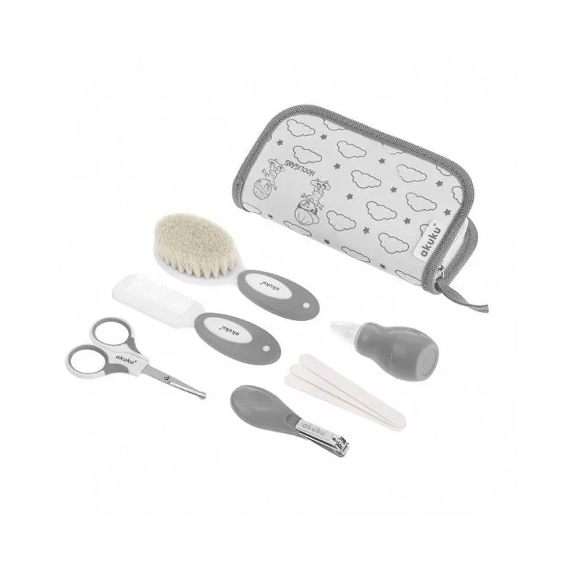 Šķēres ar plāniem metāla asmeņiem un noapaļotām malām.Knaibles palīdzēs jums droši un uzticami apgriezt nagus. Nagu vīle viegli noņem naga nelīdzenumus, lai pasargātu mazuli no saskrāpēšanās.Mīksta dabisko saru suka un ķemme ar neslīdošu rokturi rūpēsies par jūsu mazuļa matiem.Bumbieris ar mīkstu galu elpceļu tīrīšanai, ūdens un ausu sēra noņemšanai no mazuļa ausīm.Lai samazinātu risku, ieteicams griezt nagus, kamēr bērns guļ.Nedrīkst izmantot dezinfekcijas līdzekļus.Pamanot pirmās nolietošanās vai bojājuma pazīmes, izmetiet.Glabāt bērniem neredzamā un nepieejamā vietā.