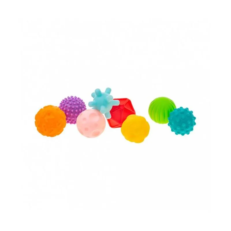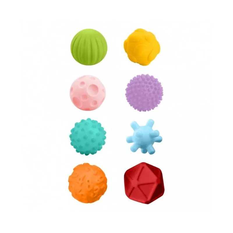 8 mīksto gumijas sensoru bumbiņu komplekts iepazīstinās jūsu mazuli ar taustes, krāsu un skaņas pasauli.