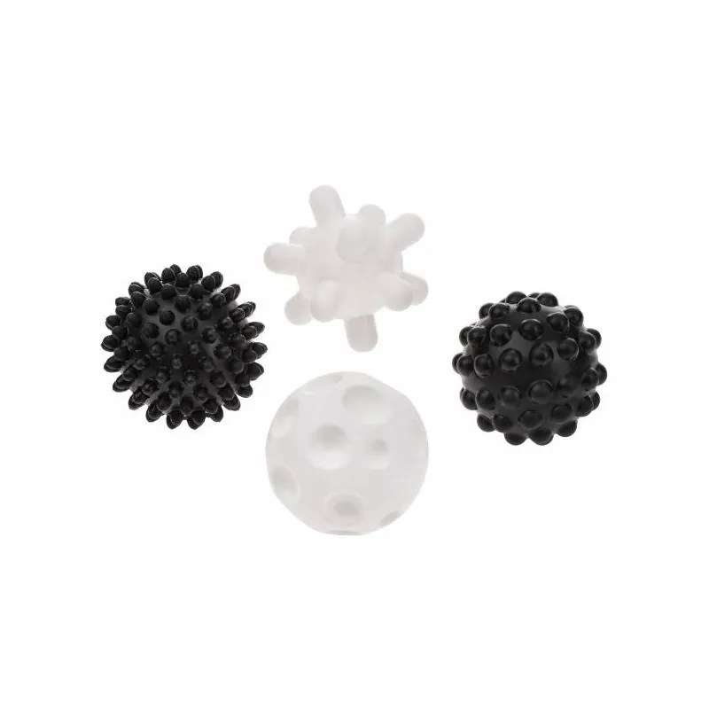 Masāžas laikā bumbiņas atslābina muskuļu spriedzi.Veicināt redzes attīstību.Zobu šķilšanās periodā tās palīdzēs mazināt smaganu sāpes, masējot.Lieliski piemērots peldēšanās izklaidēm.Tās nesatur ftalātus, BPA un smagos metālus.To unikālās formas un struktūra ļauj masēt un atslābināt muskuļu spriedzi.Tās būs neaizstājamas izklaidējoties. Iesaka fizioterapeiti. Tās nodrošina daudz sensoru iespaidu. Melnbaltās krāsas lieliski stimulē mazuļa redzi, jo pirmajos dzīves mēnešos bērns neatšķir krāsas. Bumbiņām ir caurumi, tāpēc spēlēties ūdenī būs vēl jautrāk.Izmērs: 6,7 cm; 6,3 cm; 6,0 cm.