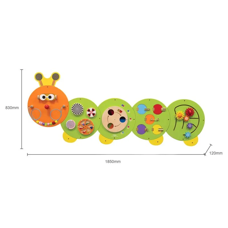 Jis susideda iš 5 sekcijų ir yra pagamintas draugiško vikšro pavidalu.Pirmoje sekcijoje yra metalinė kilpa su mediniais karoliukais, vaikas pirštais gali laisvai judėti labirintu.Antroje – spalvoti langai su užraktais, už kurių yra įvairūs paviršiai lietimui.Trečiame - yra daug žaislų, kuriuos galima pasukti: lenktynių trasa, apskritimai su raštais, apskritimas su spalvotais rutuliais viduje, spalvų maišymo ratas.Žaislas suteikia vaikams daug įdomių objektų, kuriuos galima atrasti. Vaikai ne tik mankština pirštus, bet ir lavina loginį mąstymą, didina dėmesio koncentraciją, tobulina rankinius įgūdžius, ugdo smalsumą, mokosi spręsti priežasties-pasekmės ryšius. Mokomoji panelė tinka Montessori tobulėjimui.Visas daiktas pagamintas iš lakuoto medžio ir nudažytas netoksiškais dažais. Žaislas skirtas vyresniems nei 18M+ metų vaikams.Išmatavimai: 839 mm x 120 mm x 1850 mm.Svoris: 10kg.