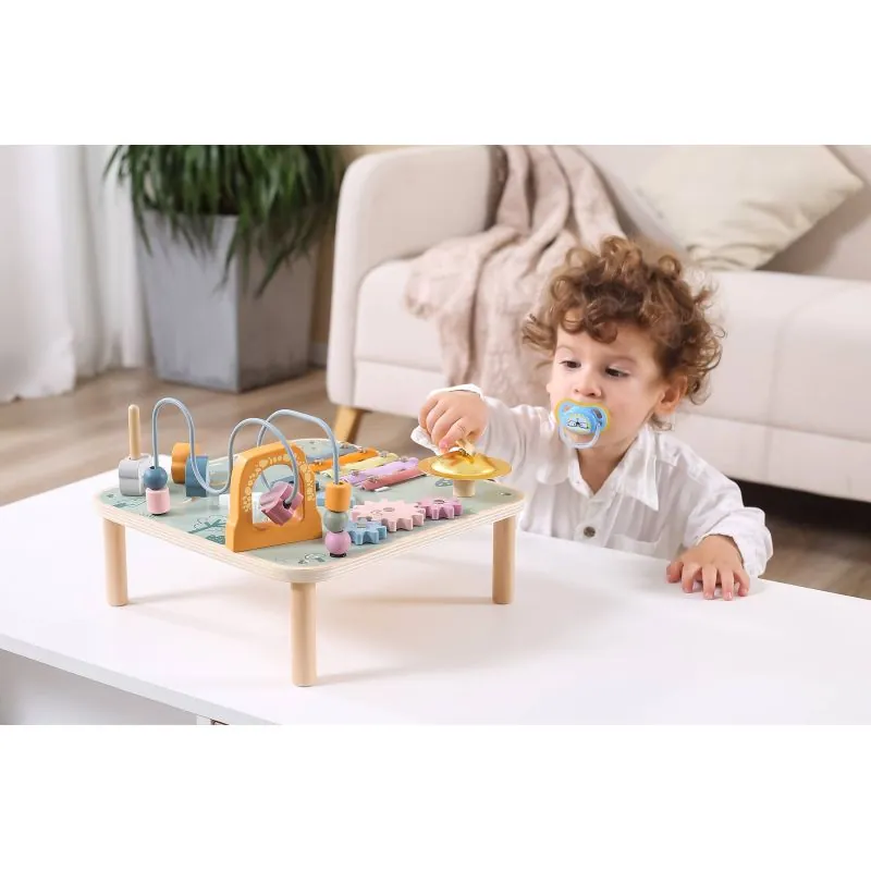 Dzinēja cilpas, šķirotājs, konuss, zobrati un slīdnis attīsta motoriskās prasmes, veiklību un koncentrēšanos. Zvani un cimbalas ļauj iepazīt skaņu daudzveidību un radīt pirmās kompozīcijas.Daudzfunkcionāla rotaļlieta ļauj spēlēties vairākiem bērniem vienlaikus. Tas veicina radošumu, iztēli un sadarbību.Visa lieta ir izgatavota no dižskābarža koka un krāsota ar netoksiskām maigām krāsām, kas piesaistīs aci un veicinās kopīgu spēlēšanos, sniedzot daudz prieka. Krāsas ir 100% drošas, atbilst EN71 un ASTM drošības standartiem.