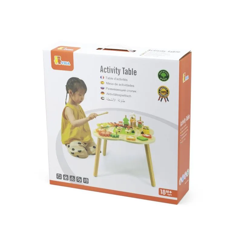 Galds ir pietiekami liels, lai vienlaikus varētu spēlēt vairāki bērni. Šis izglītojošais galds ir ļoti bagātīgi aprīkots ar daudziem spēlēm. Galdu veido: vilciena sliedes ar lokomotīvi un vagonu, šķirotājs, šķīvis, zobrati, piramīda, ksilofons skaņu radīšanai un daudz kas cits.Galds sastāv no vairākiem elementiem un apvieno dažādas spēles, kas pilda savu lomu bērna attīstībā. Spēles ir krāsainas, aizraujošas un smalki nodod bērnam jaunas zināšanas un prasmes.Vilciena sliedes ar rindu un dažādiem šķēršļiem ir brīnišķīga izklaide bērnam. Bērna uzdevums ir pareizi savienot ceļus un braukt ar vilcienu pa sliedēm, izbraucot cauri dzirnavām, šķīvim, skaņas cimbālēm, vārtiem ar zvaniņu. Visi darbi rada dažādas un interesantas skaņas bērna ausij.Uz galda novietotie zobrati – mehānisms, kas ir viens no iecienītākajiem. Krāsainie zobrati skaidri parāda bērniem cēloņu un seku saistību starp aci un roku. Bērns uzzina, ka katrai viņa kustībai ir redzams rezultāts. Rotaļlieta stiprina vecāku un bērnu saikni. Šis koka galds mudina vecākus būt kopā ar bērnu un parādīt viņam detaļas un elementus, ko viņš redz uz galda. Plašā spēļu izvēle nodrošinās ilgstošu izklaidi.Bērniem no 18 mēnešiem.Rotaļlietas elementi ir iepakoti estētiskā kartona kastē, rotaļlieta lieliski derēs dāvanai!Visi priekšmeti ir izgatavoti no dižskābarža koka, krāsoti ar netoksiskām pasteļkrāsām.