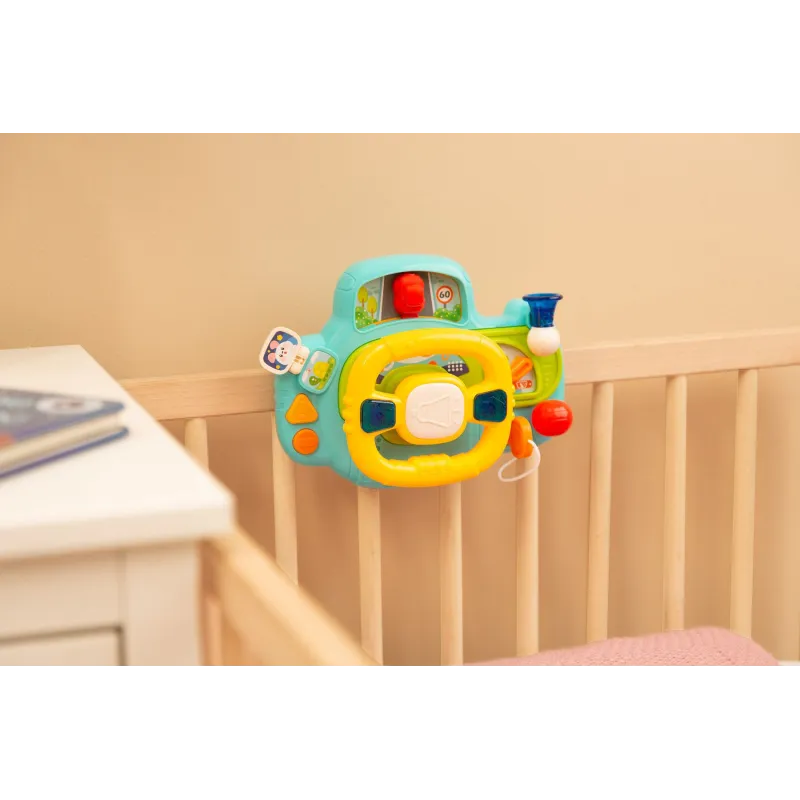 Stūres panelī ir pogas un gaismas, kas mijiedarbojas ar skaļruni;Skaļrunis atskaņo patīkamas melodijas un automašīnas skaņas;Stūri var piestiprināt pie ratiņiem, gultiņas vai citiem priekšmetiem;Šī stūre var ceļot visur kopā ar jūsu mazuli;Komplektā ir stūre ar skaņas signālu;Pagrieziena rādītāji;Pārnesumu pārslēgšanas svira;Atslēga, kas imitē automašīnas iedarbināšanu;Papildu pogas;Velcro stiprinājumi stūres piestiprināšanai;Uz stūres ir poga, kas ieslēdz skaņas ar diviem skaļuma regulēšanas līmeņiem.