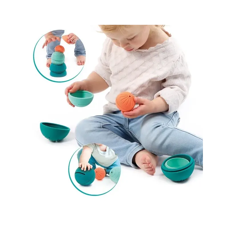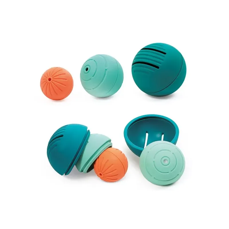 Trīs mīkstas bumbiņas, kas sastāv viena otras iekšpusē;Bumbiņas pielāgotas mazām rociņām;Bumbiņu virsma ļauj iepazīties ar dažādām tekstūrām;Attīsta taustes un kustību koordināciju;Lieliska izklaide mazuļu peldēm - jautri vērot caur dažāda izmēra bumbiņu caurumiem tekošo ūdeni;Izgatavotas no 100% silikona;Ieteicams bērniem no 6 mēnešiem;Bumbiņu izmēri Ø 8,4 cm, Ø 6,9 cm Ø 5,3 cm.