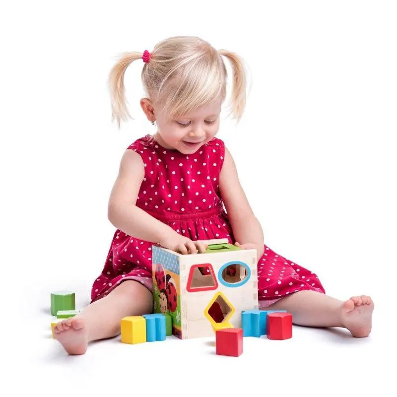 Izglītojošs kubs - formu šķirotājs. Katrai kuba pusei ir caurumi, kuros jāievieto atbilstoša forma - rombs, zvaigzne, trīsstūris, piecstūris, zieds, trīsstūris utt.