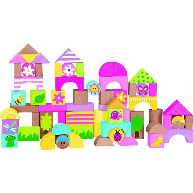 Švelnių, pastelinių spalvų dekoruotos kaladėlės dėžutėje. Kaladėlėse vaizduojamos gėlytės, drugeliai, pievos vabaliukai.